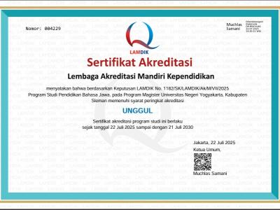 Mengawali tahun 2026 alhamdulillah S2 Pendidikan Bahasa Jawa memperoleh predikat unggal. Terimakasih kepada seluruh tim yang mendukung sehingga S2 Pendidikan Bahasa Jawa dapat Unggul. Matur nuwun kepada mas Galang Ka borang, ingkang teras kemawon berjuang, ngantos teles kebes riwenipun netes...